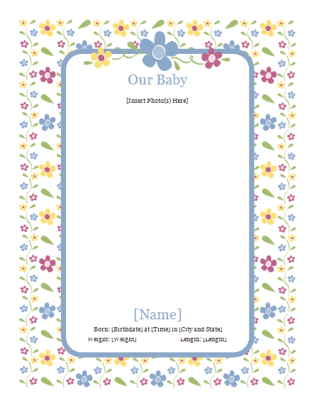 This infant photograph collection template, highlighting beautiful bloom designs, contains a spread page and twelve month to month pages with space for photographs, date, infant's weight and length, and different notes.